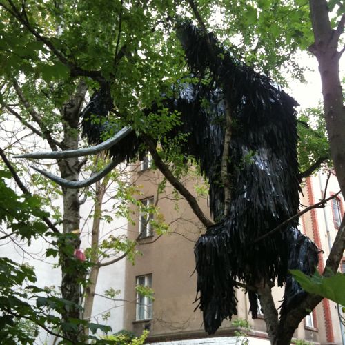 WOOLY MAMMOTH MADE OF GARBAGE BAGS IN A TREE